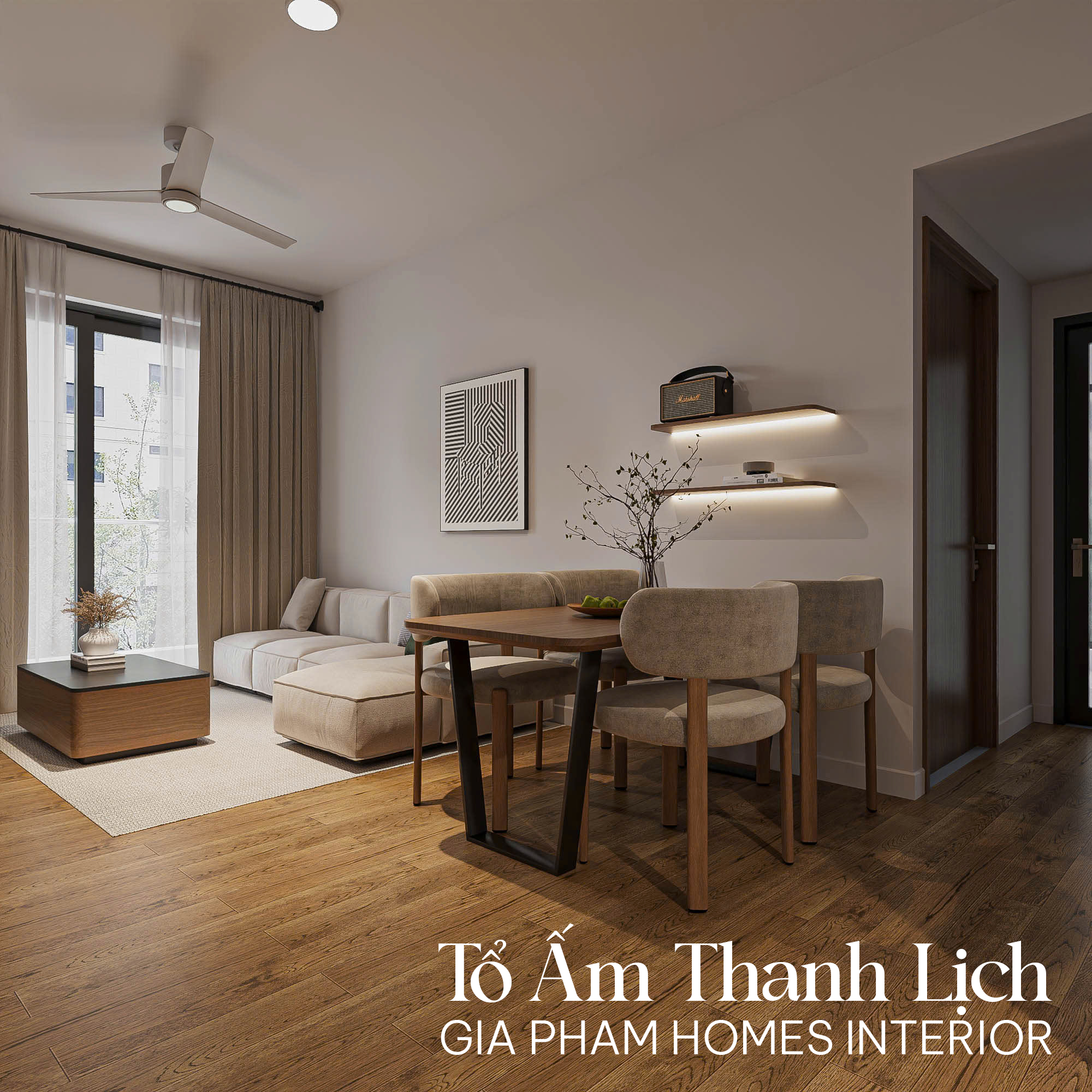 • Hệ kệ Tivi treo tường: Gia Phạm Homes sử dụng giải pháp kệ treo giúp giải phóng mặt sàn, tạo cảm giác không gian rộng hơn. Kệ được gia cố bằng vít chịu lực chuyên dụng, đảm bảo an toàn tuyệt đối.